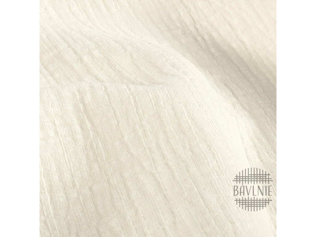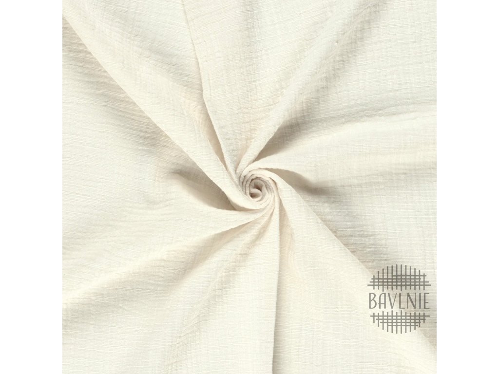 Dvojvrstvý slubmušelín (někdy označovaný i jako dvojitá gázovina) je úžasný materiál, který spojuje dvě tenké vrstvy mušelínu jemným prošitím – díky tomu je měkký a prodyšný. Slubmušelín má lícovou stranu ve vzhledu lnu, tedy sem tam hrubší nitku, rubová strana je hladká. Po namočení se nekrabatí jako klasický mušelín, ale zůstává krásně hladký. Na těle je velice příjemný.