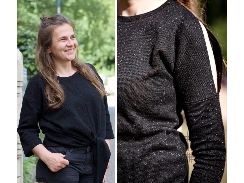 Selanik s nádechem lurexu má hladkou rubovou stranu jen z bavlny, takže je lurex viditelný a hmatatelný pouze na přední straně. Látka tak kombinujeb pohodlné nošení s nádechem elegance.