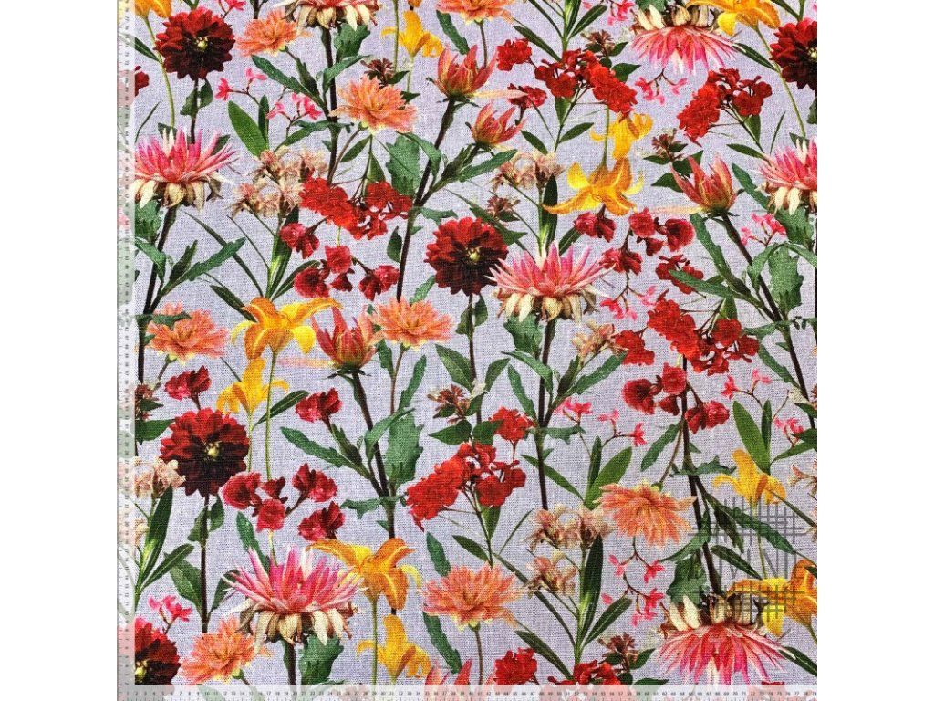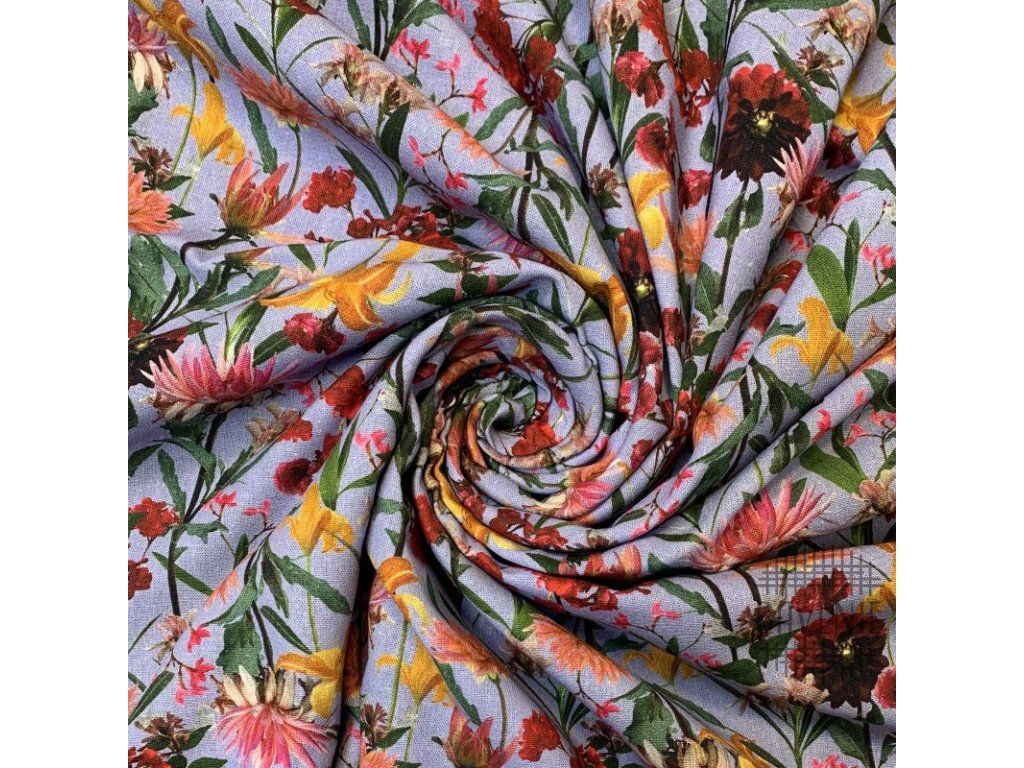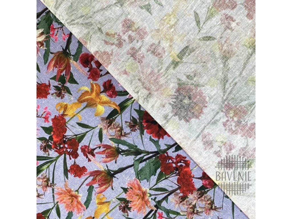 Plátno len/viskóza Květiny na světle modré