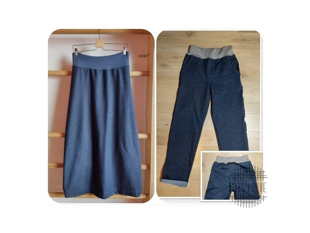 Úpletová džínovina vypadá jako džínovina, ale je pletená, nikoli tkaná. Hodí se, pokud chcete ušít něco, co vypadá jako džíny nebo slušné kalhoty, ale je to měkké, poddajné a pohodlné.